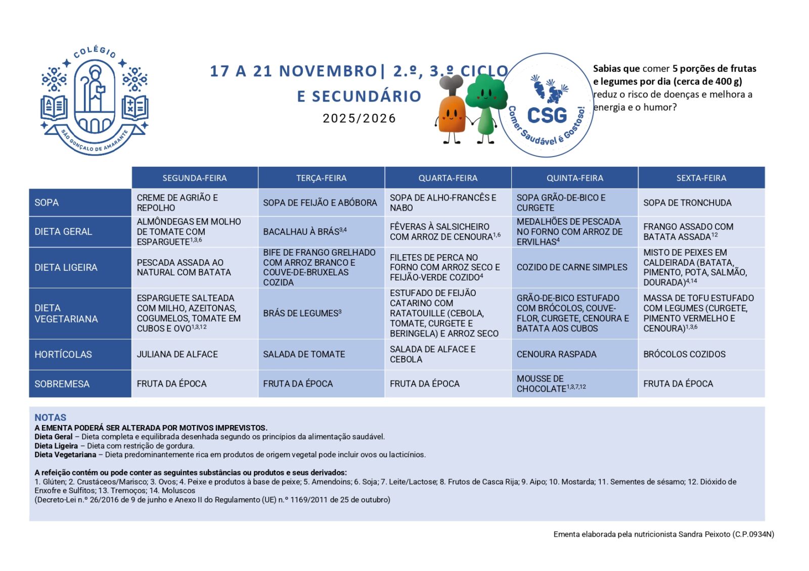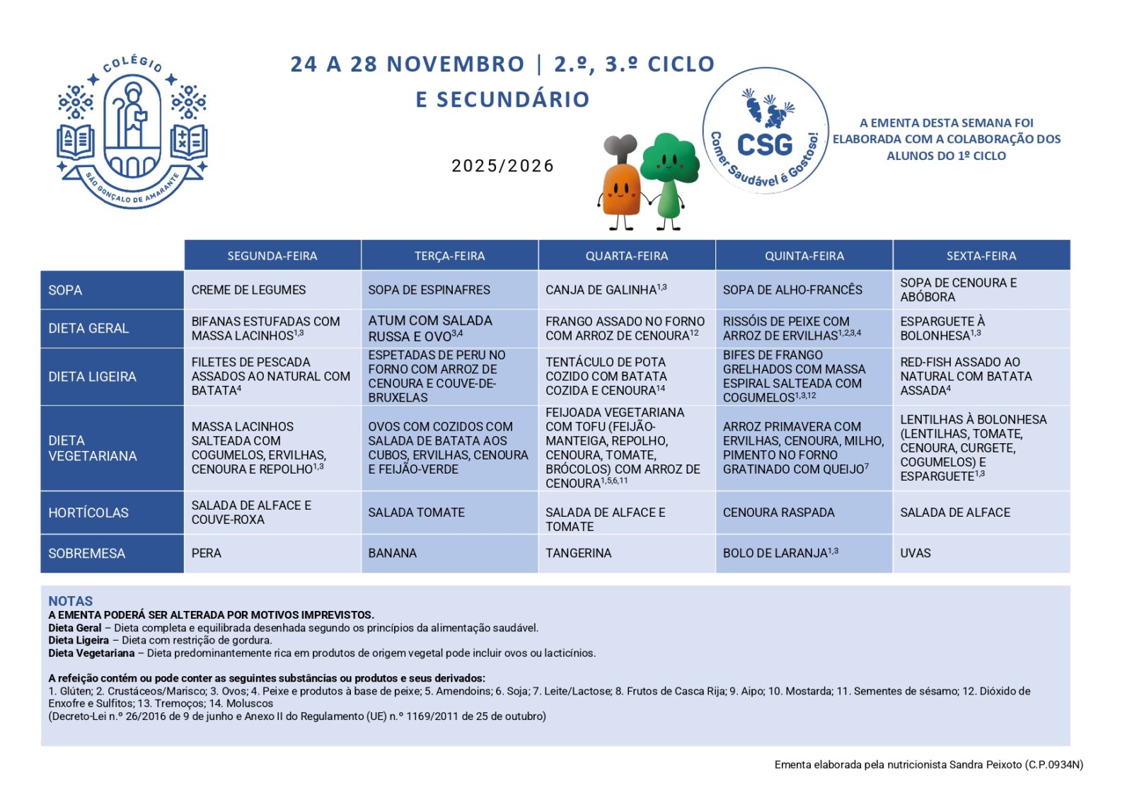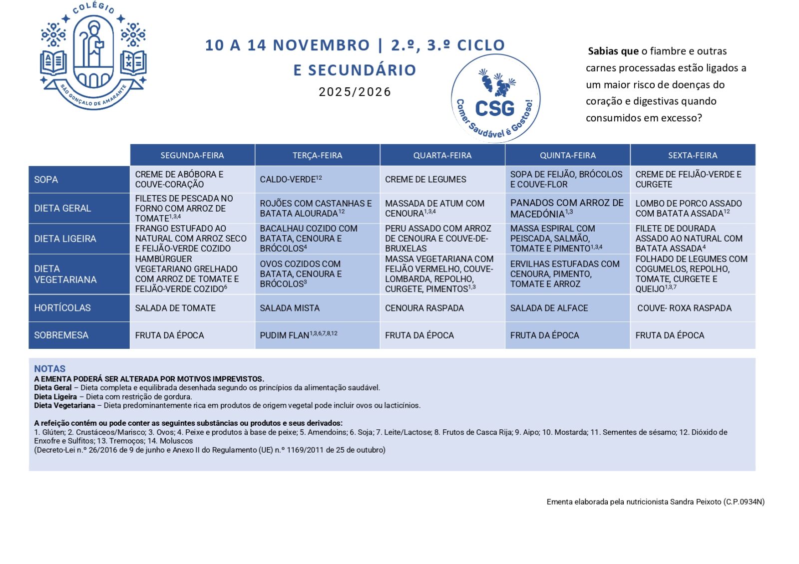 Ementas Ementa 10 - 14 nov 2025 2.º, 3.º Ciclo e Secundário 1.º Ciclo Ementa 17 - 21 nov 2025 2.º, 3.º Ciclo e Secundário 1.º Ciclo Ementa 24 - 28 nov 2025 2.º, 3.º Ciclo e Secundário 1.º Ciclo