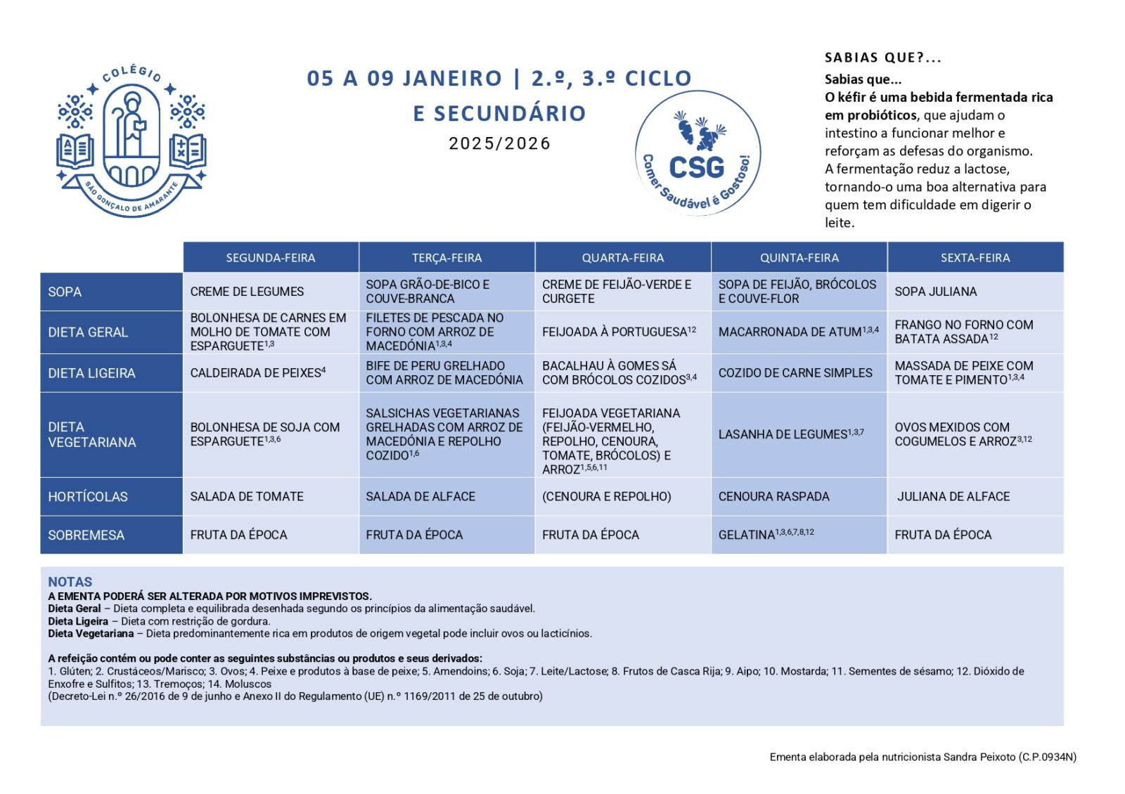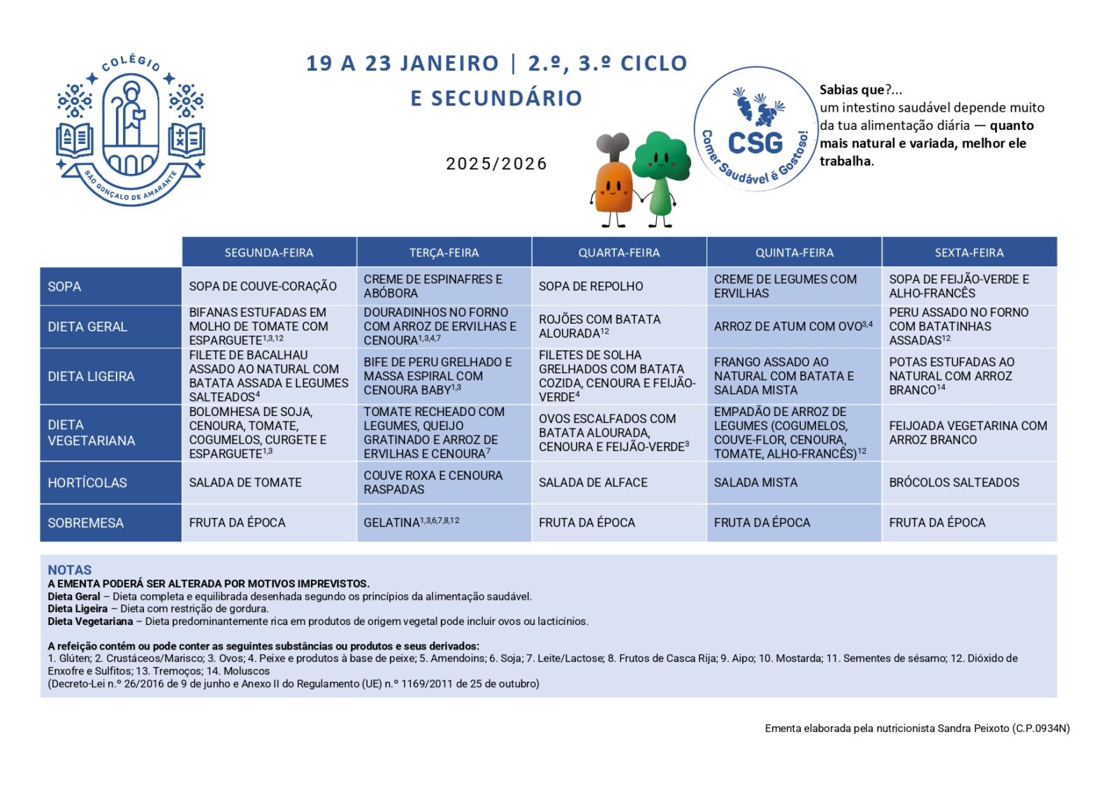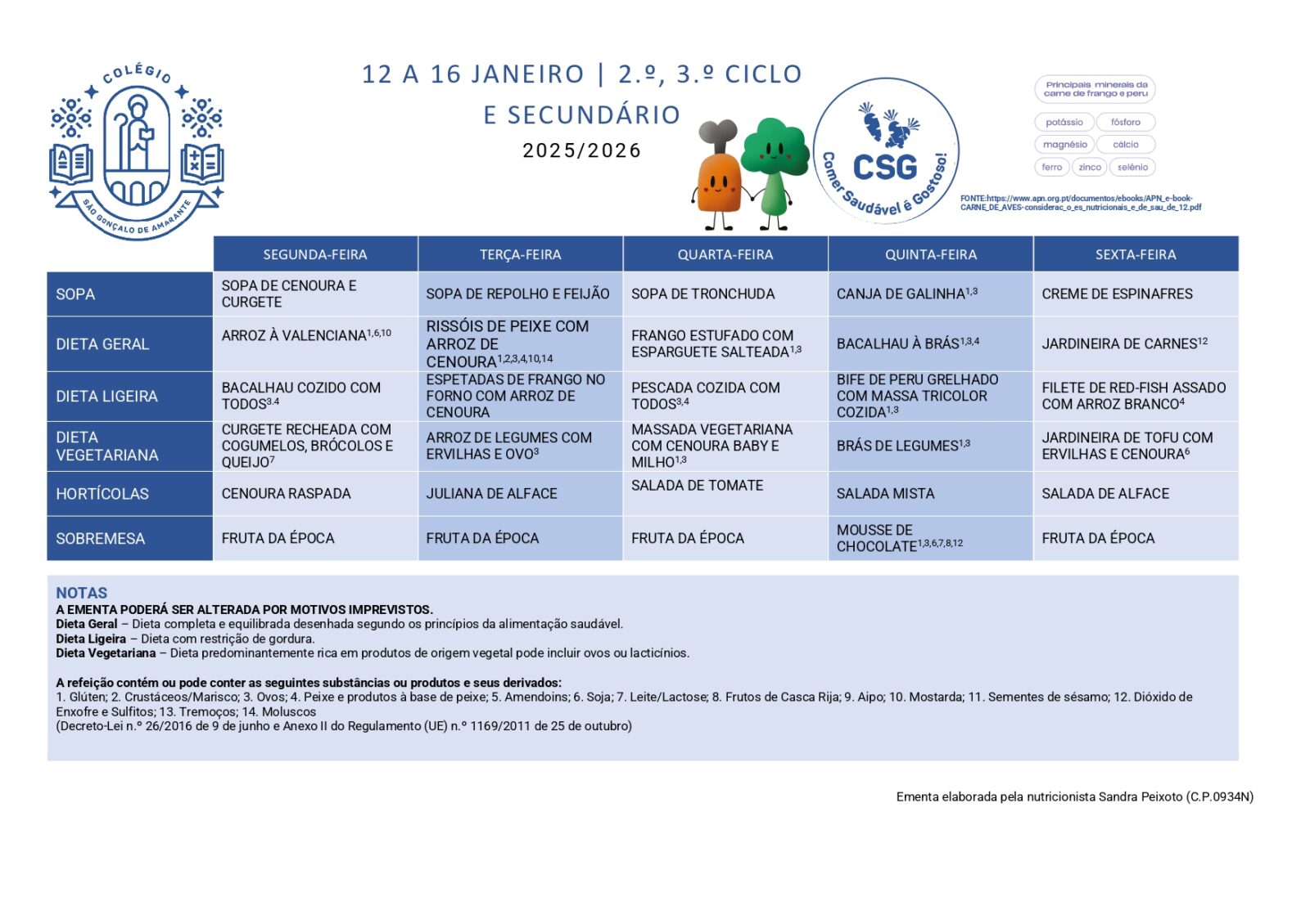 Ementas Ementa 22 e 23 dez 2025 Ementa Geral Ementa 28 e 29 dez 2025 Ementa Geral Ementa 05 e 09 jan 2026 2.º, 3.º Ciclo e Secundário 1.º Ciclo Ementa 12 e 16 jan 2026 2.º, 3.º Ciclo e Secundário 1.º Ciclo Ementa 19 e 23 jan 2026 2.º, 3.º Ciclo e Secundário 1.º Ciclo