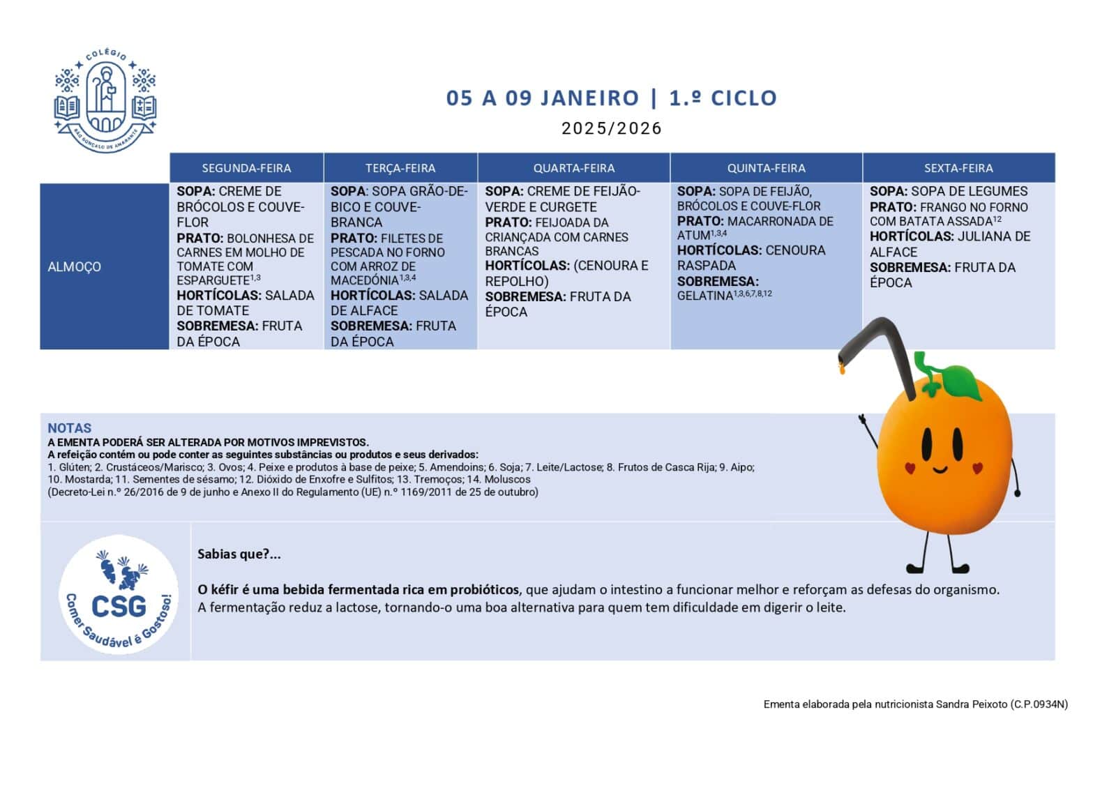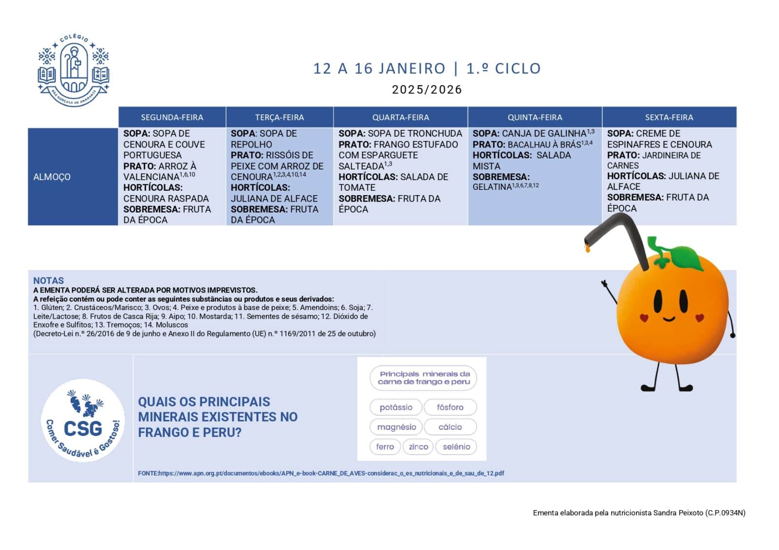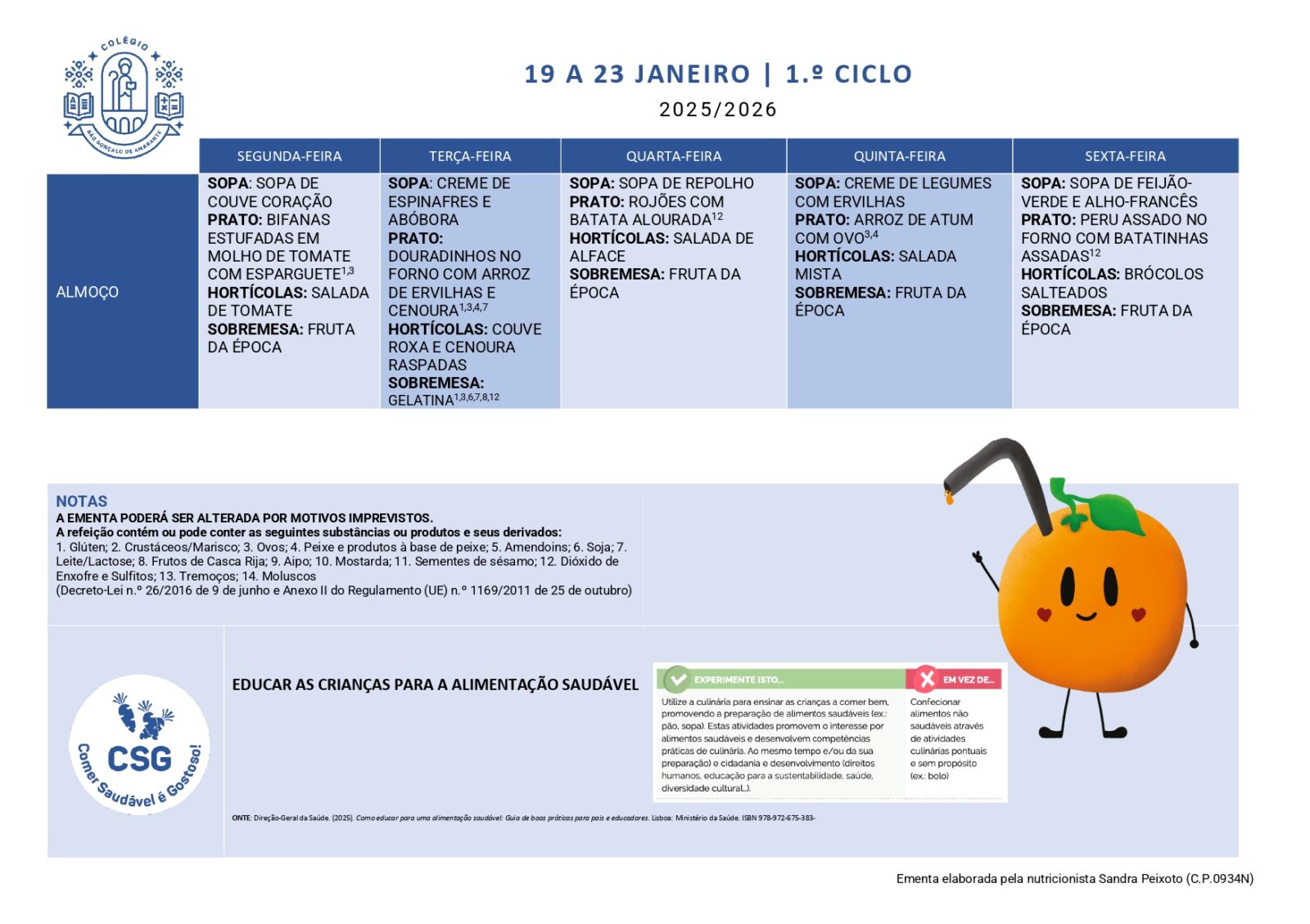 Ementas Ementa 22 e 23 dez 2025 Ementa Geral Ementa 28 e 29 dez 2025 Ementa Geral Ementa 05 e 09 jan 2026 2.º, 3.º Ciclo e Secundário 1.º Ciclo Ementa 12 e 16 jan 2026 2.º, 3.º Ciclo e Secundário 1.º Ciclo Ementa 19 e 23 jan 2026 2.º, 3.º Ciclo e Secundário 1.º Ciclo